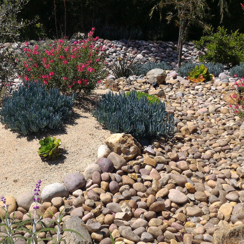 Native plants, grasses, or succulents are added along the edges to soften the design and enhance the natural appearance.